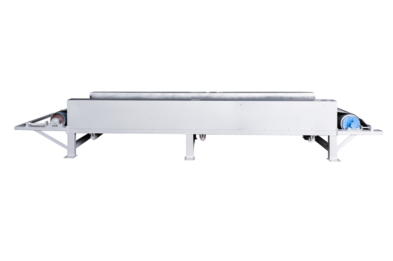 该设备采用连续式槽型带式,物料由格栅或脱水机卸料口落入输送带上,在电动滚筒的驱动下,物料从一端移动到另一端,末端与垃圾桶相衔接,再另行处理。